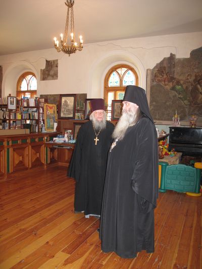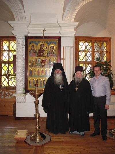 В сопровождении о. Андрея Горячева архимандрит Тихон и А.Н. Панин осмотрели обитель, вознесли свои молитвы в храме во имя Тихвинской иконы Божией Матери, а также помолились у всех храмовых святынь.