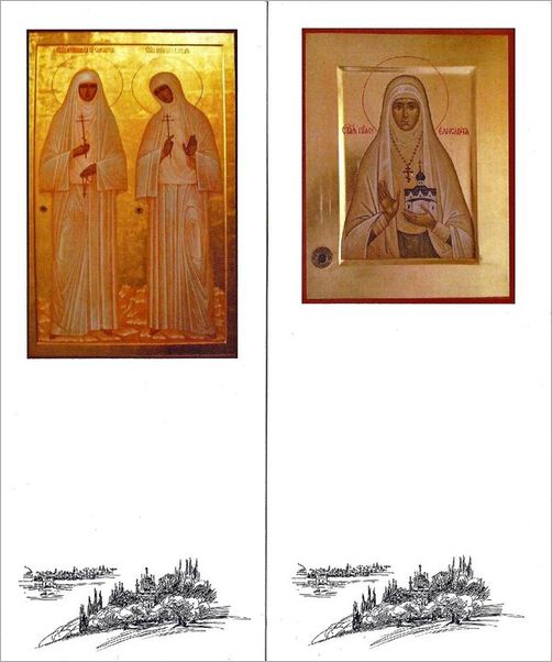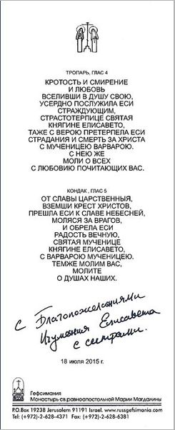 Игуменья Елизавета раздала всем присутствующим на память открытки с изображением икон прмцц. великой княгини Елисаветы Феодоровны и инокини Варвары, с текстами тропаря и кондака, а также благопожеланиями от игуменьи и сестер Гефсиманской обители.