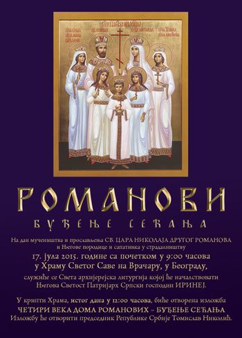 В 97-ю годовщину мученического подвига императора Николая II и членов его семьи, 17 июля, в Белграде откроется выставка «Четыре столетия Дома Романовых. Пробуждение воспоминания». Выставка организована Обществом возведения храма Святого Саввы, сопредседателями