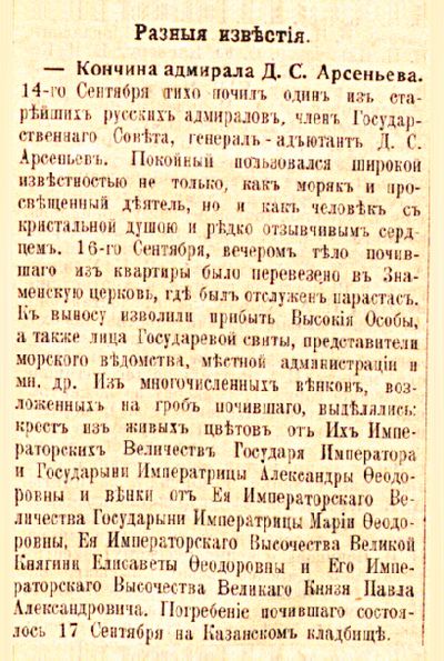 Подробнее о захоронении Д.С. Арсеньева см. на нашем сайте: Казанское