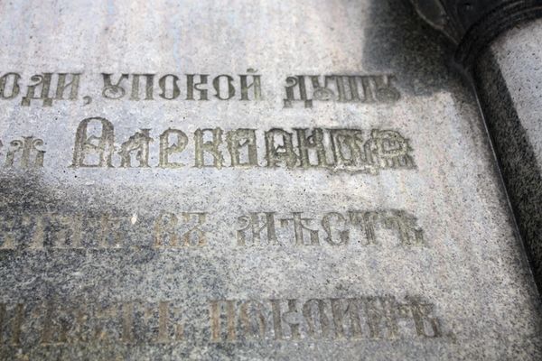 Виктор Анатольевич показал варварски уничтоженные дореволюционные надписи на памятнике, а также то место, где в подлинную того времени надпись, вбито имя "Александр". При внимательном осмотре явно и отчетливо под ним видно имя "Варвара". Было также обнаружено и клеймо мастера М.Кузнецова, изготовившего этот художественный надгробный памятник.