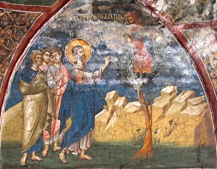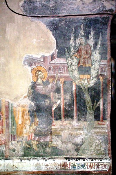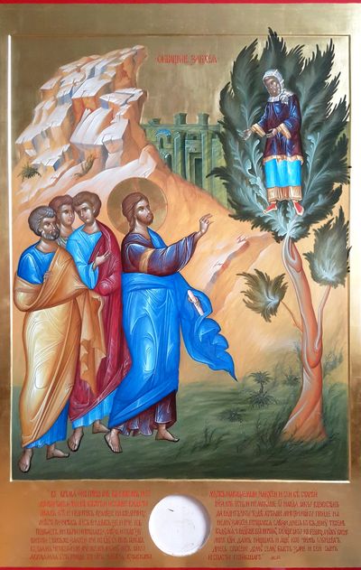 «Во время оно прииде Иисус во Иерихон. И се муж нарицаемый закхей, и сей бе старей мытарем, и той бе богат: и искаше видети Иисуса, кто есть, и не можаше от народа, яко возрастом мал бе. И предитек, возлезе на ягодичину, да видит, яко хотяше мимо ея проити. И яко прииде на место, воззрев Иисус виде его, и рече к нему: закхее, потщався слези: днесь бо в дому твоем подобает ми быти. И потщався слезе, и прият его радуяся. И видевше вси роптаху, глаголюще, яко ко грешну мужу вниде витати. Став же закхей рече ко Господу: се пол имения моего, Господи, дам нищым: и аще кого чим обидех, возвращу четверицею. Рече же к нему Иисус: яко днесь спасение дому сему бысть, зане и сей сын авраамль есть: прииде бо Сын человечь взыскати и спасти погибшаго» (Лк. 19, 1-10).