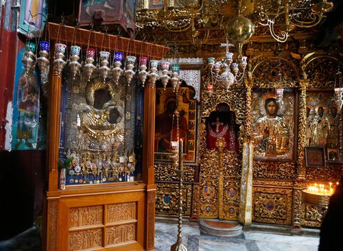 Следующим пунктом посещения стал монастырь Ставроникита. В этой обители хранится одна удивительная святыня – чудотворная мозаичная икона святителя Николая Чудотворца «Стриедас» (по-гречески «Раковина»). Предание гласит, что икону бросили в море в IX веке иконоборцы. Из моря ее достали в прекрасном состоянии, но после того как от нее отделили раковину, на челе святого Николая осталась глубокая кровоточащая (будто на живом теле) язва. Паломники приложились и поклонились древней святыне.