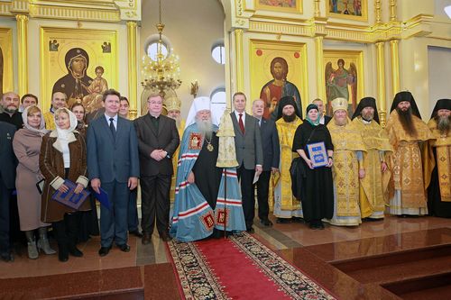 По завершении своих слов Владыка митрополит отметил особо потрудившихся в деле восстановления монастыря благотворителей епархиальными наградами.