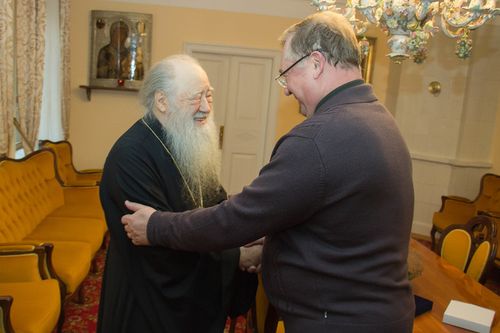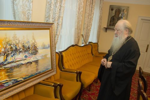 Сергей Вадимович Степашин поздравил Владыку с юбилеем и вручил ему за труды на поприще Палестинского Общества высший почетный памятный знак ИППО - орден «Вифлеемская звезда» и подарил картину с весенним русским пейзажем.