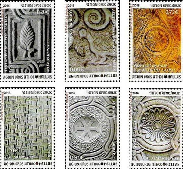 Почтовые марки с изображением мраморных барельефов и украшений афонских монастырей выпустила в 2016 году Греческая почта (ΕΛΤΑ).