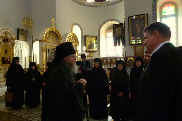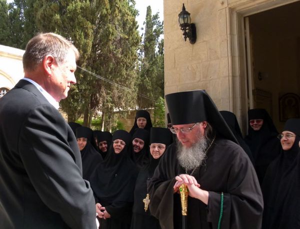 У главного входа в монастырский храм румынского президента встретили начальник Духовной Миссии Русской Зарубежной Церкви в Иерусалиме архимандрит Роман (Красовский) и настоятельница обители игуменья Моисея с насельницами.