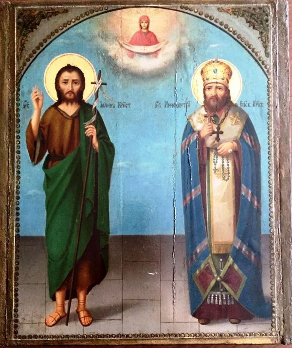 Изображение на иконе святого пророка Иоанна Крестителя и святителя Иннокентия Иркутского, прославленного в России в 1804 году,  позволяет предположить, что икона предназначалась в дар новокрещенным. Надписи и особенности иконографии свидетельствуют о том, что образ был написан в самом начале ХХ века афонскими мастерами.  В 1868 году в  русском Андреевском скиту на Афоне при больнице был заложен храм во имя святителя Иннокентия, епископа Иркутского, который был впоследствии  построен на средства богатого золотопромышленника Иннокентия Михайловича Сибирякова, который поступил монахом в Свято-Андреевскую обитель.
