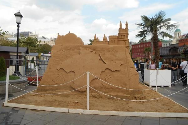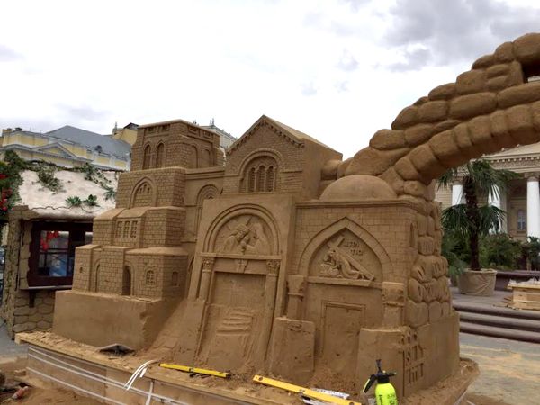 Для имитации атмосферы святого града на Театральной площади появились зеленые пальмы. Скульпторы уже вырезают из песка с водостойкой пропиткой главное украшение площадки - барельеф