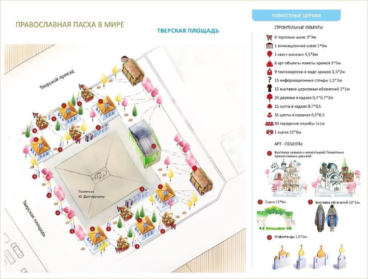 Здесь можно будет совершить прогулку среди храмов и монастырей Поместных Церквей со всего мира, уменьшенные копии которых, в рамках весеннего фестиваля, собрали на одной площади вокруг памятника Юрию Долгорукому.