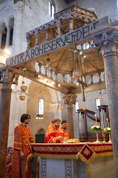 В канун празднования дня перенесения мощей святителя Николая из Мир Ликийских в Бар-град, вечером 21 мая, в верхнем и нижнем храмах Патриаршего Никольского подворья в Бари было совершено торжественное всенощное бдение. Праздничное богослужение возглавил митрополит Екатеринбургский и Верхотурский Кирилл. Его Высокопреосвященству сослужили митрополит Ростовский и Новочеркасский Меркурий, архиепископ Пятигорский и Черкесский Феофилакт, епископ Россошанский и Острогожский Андрей, епископ Череповецкий и Белозерский Флавиан, епископ Семилукский Сергий, викарий Воронежской епархии и многочисленное духовенство.