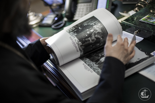 Особый интерес для читателей составит фотоальбом монастыря, где в хронологическом порядке представлены сохранившиеся еще с XIX века архивные фотоснимки насельников, а также старинная фотография, на которой изображено чудо явления на Святой Горе Божией Матери. Ее силуэт изобразился на фото именно в тот момент, когда Она обращается за благословением к игумену Макарию. Первоначально имелся лишь негатив фотографии, и лишь при обработке в фотомастерской обители стало явно видно, что на снимке изображена Царица Небесная.