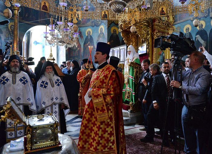 27 мая по прибытии в Свято-Пантелеимонов монастырь Патриарх Кирилл и сопровождавшие его архиереи Русской Православной Церкви в храме святого великомученика и целителя Пантелеимона   поклонились ковчегу с цельбоносной главой великомученика и целителя Пантелеимона   и совершили молебен всем русским подвижникам, просиявшим на Святой Горе.
