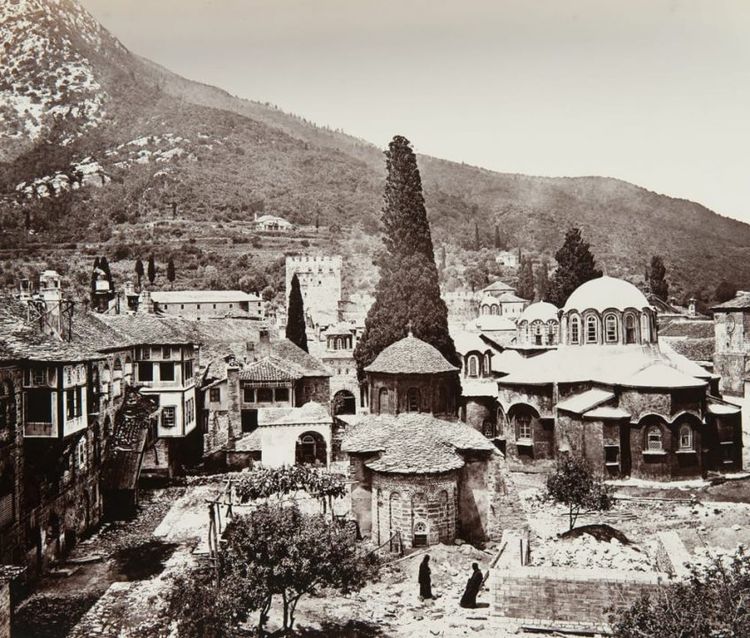 Лавра святого Афанасия (Великая лавра). Из альбома императора Александра II. Афон, фотоателье Свято-Пантелеимонова монастыря, конец 1860-х‒1870-е. Государственный Русский музей