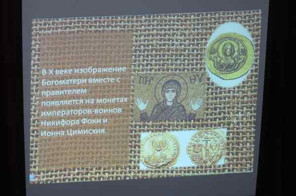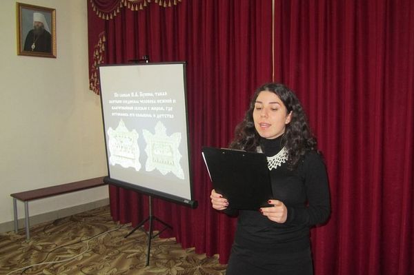 В рамках просветительского проекта студенты, участники студенческого научного кружка "Православный Восток" кафедры "Православная культура и теология" ИСОиП (филиала) ДГТУ Лилит Симонян и Анастасия Илларионова красочно рассказали собравшимся о афонских и палестинских церковных изделиях из перламутра и о сакральных изображениях на византийских средневековых монетах. Выступления студентов сопровождались фотопрезентациями, а затем, на выставке были воочию продемонстрированы предметы, представленные на фото.