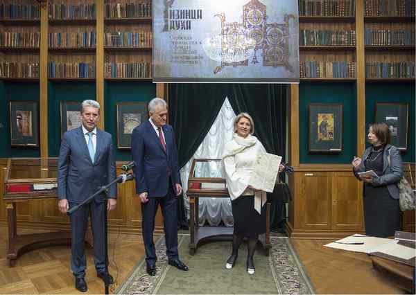 К визиту сербского президента в РНБ в зале Корфа открылась выставка уникальных манускриптов "Ризница духа: сербская рукописная книга в фондах Российской национальной библиотеки". На выставке представлено 20 рукописей XII–XVII вв., написанных сербским письмом в различных центрах Балканского полуострова и на Святой Горе Афон.