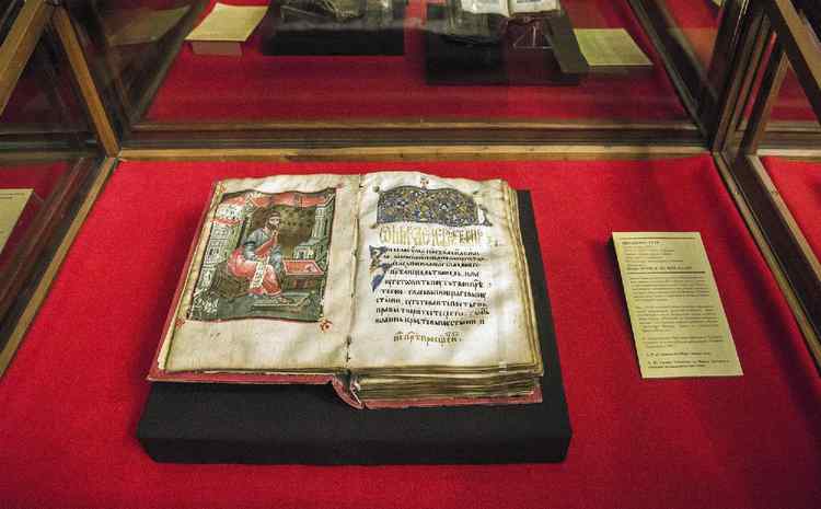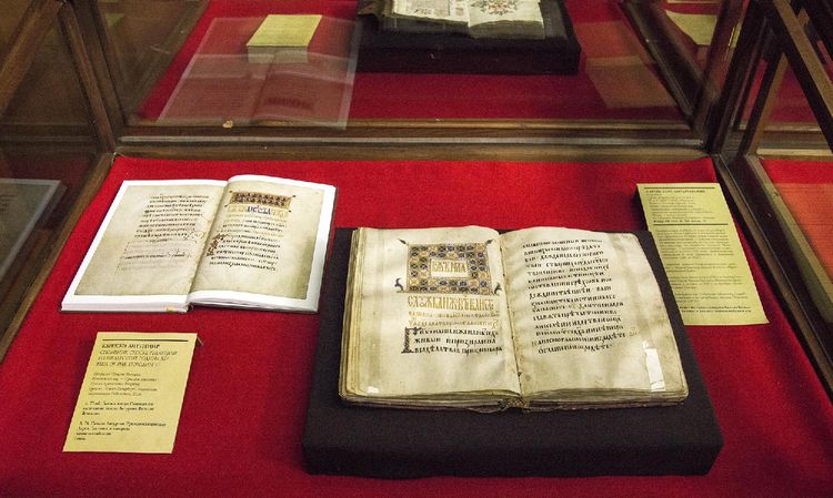 Центральное место в экспозиции заняли 3 самых знаменитых памятника сербской письменности - три Евангелия: Мирославово, Вуканово и Радославово, поступивших в Императорскую Публичную библиотеку в 1883 г. в составе коллекции епископа Порфирия (Успенского).