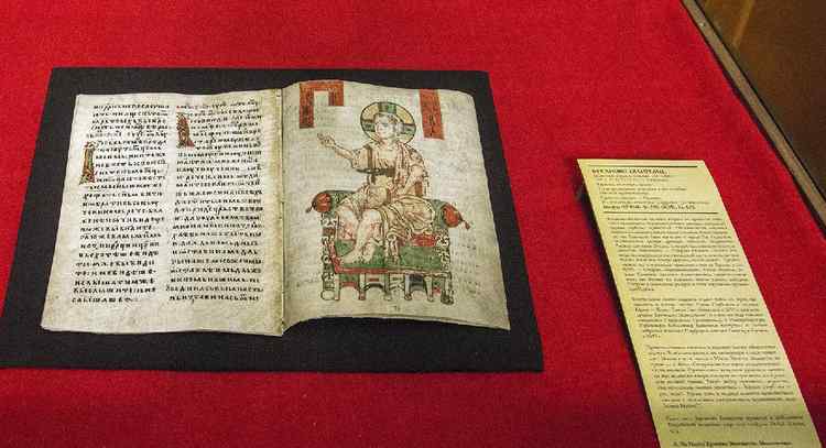 Главный экспонат выставки - оригинал петербургского листа древнейшего сербского памятника письменности Мирославова Евангелия.