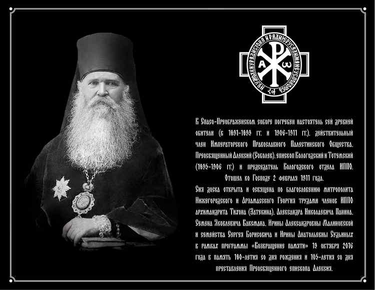На памятной доске выбита надпись, которая гласит: «В Спасо-Преображенском соборе погребен настоятель сей древней обители (в 1891-1893 гг. и 1906-1911 гг.), действительный член Императорского Православного Палестинского Общества, Преосвященный Алексий (Соболев), епископ Вологодский и Тотемский (1895-1906 гг.) и председатель Вологодского отдела ИППО. Отошел ко Господу 2 февраля 1911 года. Сия доска открыта и освящена по благословению митрополита Нижегородского и Арзамасского Георгия трудами членов ИППО архимандрита Тихона (Затекина), Александра Николаевича Панина, Семена Яковлевича Ваксмана, Ирины Александровны Малиновской и семейства Сергея и Ирины Судьиных в рамках программы «Возвращение памяти» 13 октября 2016 года в память 180-летия со дня рождения и 105-летия со дня преставления Преосвященного епископа Алексия».