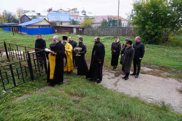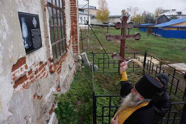 Затем все проследовали за алтарь Спасо-Преображенского собора, где архимандрит Тихон совершил освящение памятной доски Преосвященному епископу Алексию, укрепленной на стене храма, рядом с деревянным крестом, установленным в память всех погребенных на территории монастыря. В советские годы монастырское кладбище было снесено, исторические надгробия уничтожены.