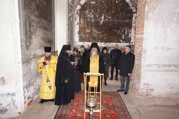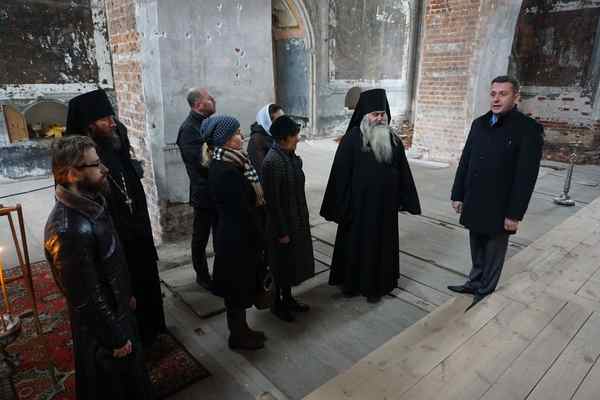 Гостей из Москвы и Нижнего Новгорода встретили временно исполняющий обязанности наместника обители, наместник Вознесенского Печерского монастыря, заместитель председателя Нижегородского отделения ИППО архимандрит Тихон (Затекин) и благочинный монастыря игумен Феодосий (Какуркин). Отец Тихон познакомил членов делегации с историей монастыря и ходом восстановительных работ.