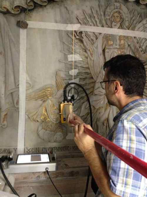 Инженер использует георадар для обнаружения стены гробницы, скрытой мраморной облицовкой