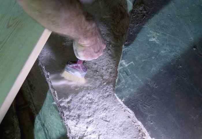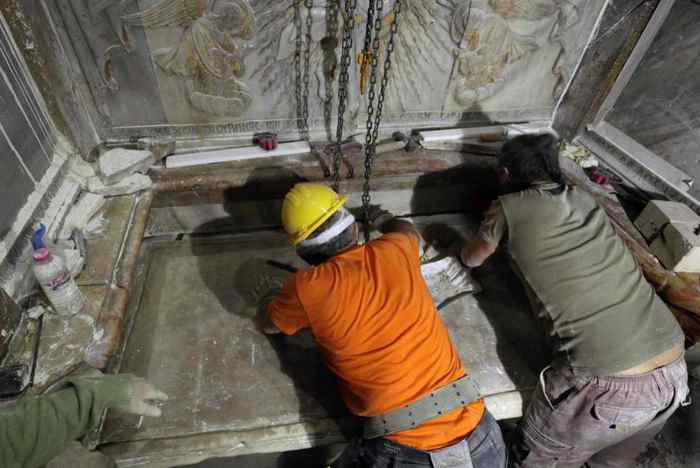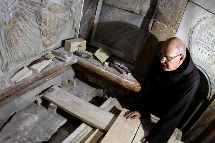 Реставратор удаляет пыль под разбитой мраморной плитой, чтобы обнажить оригинальную скалу, служившую гробницей Иисуса Христа