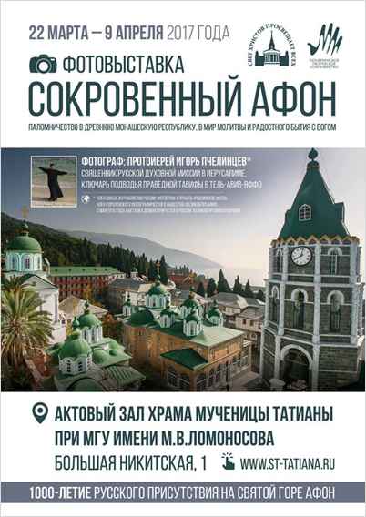 22 марта 2017 года в Актовом зале домового храма святой мученицы Татитаны при МГУ имени М.В. Ломоносова откроется фотовыставка «Сокровенный Афон».