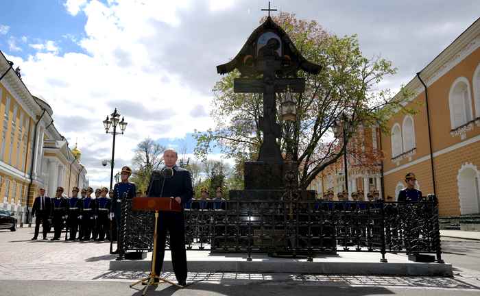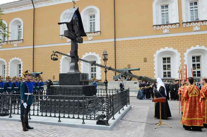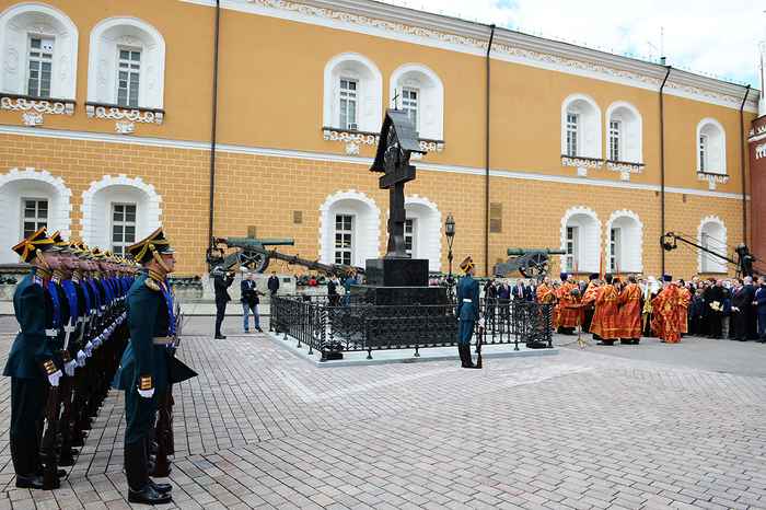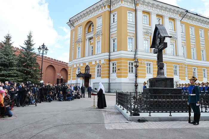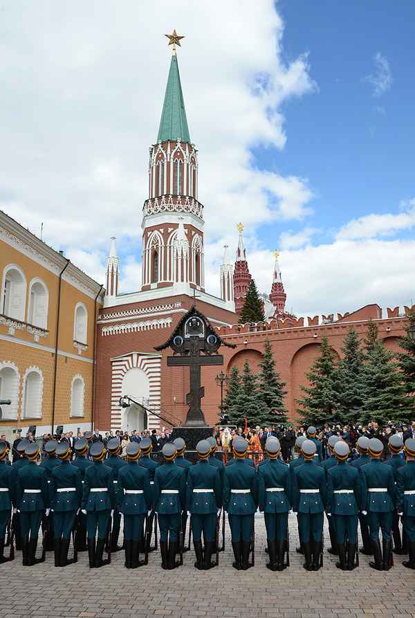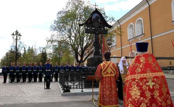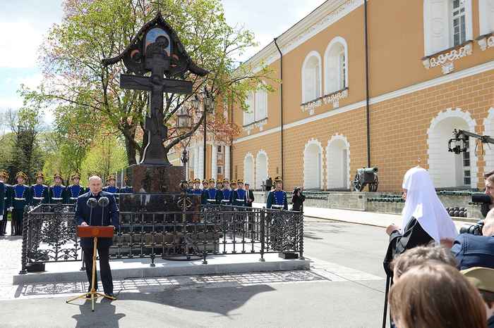 4 мая Владимир Путин и Святейший Патриарх Московский и всея Руси Кирилл приняли участие в церемонии открытия памятника-креста великому князю и председателю Императорского Православного Палестинского Общества Сергею Александровичу на месте его гибели – в сквере у Никольской башни Кремля.