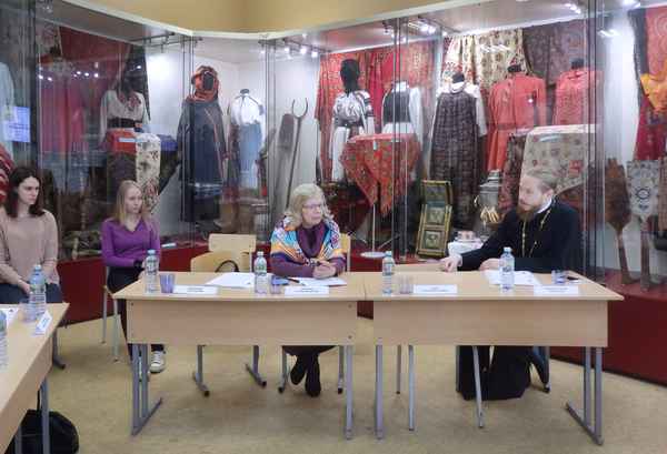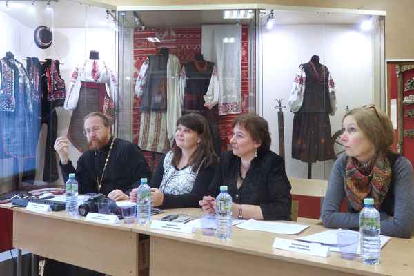 В перерыве заседания Алла Кирилловна Коненкова познакомила участников и гостей круглого стола с выставками, подготовленными специально к Дням славянской письменности и культуры. Выставка «Святая Земля», приуроченная также к 25-летию Государственной академии славянской культуры (ныне Институт славянской культуры РГУ им. А.Н. Косыгина), составлена из 68 фоторабот одного из старейших педагогов академии, замечательного фотохудожника, действительного члена Императорского Православного Палестинского Общества Юрия Васильевича Робинова. Фотографии были сделаны в 2010 г., во время поездки на Святую Землю делегации академии с паломнической и научной целью. Другая выставка – «Русская Палестина» – представляет собой собрание изданий, посвященных Святой Земле, святынь, памятных предметов, а также изделий традиционных народных промыслов Палестины и произведений народного искусства славянских стран. Традиционно к Дням славянской письменности и культуры подготовлена очередная выставка из фондов Музея славянских культур Института славянской культуры. В этом году выставка носит название «Русский платок» и посвящена представлению деятельности ситценабивных фабрик и мануфактур Московской и Владимирской губерний.