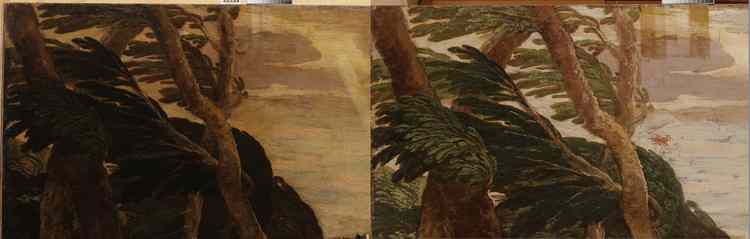 Слева - деталь картины в процессе реставрации с пробными участками раскрытия. Справа - деталь картины с контрольными участками