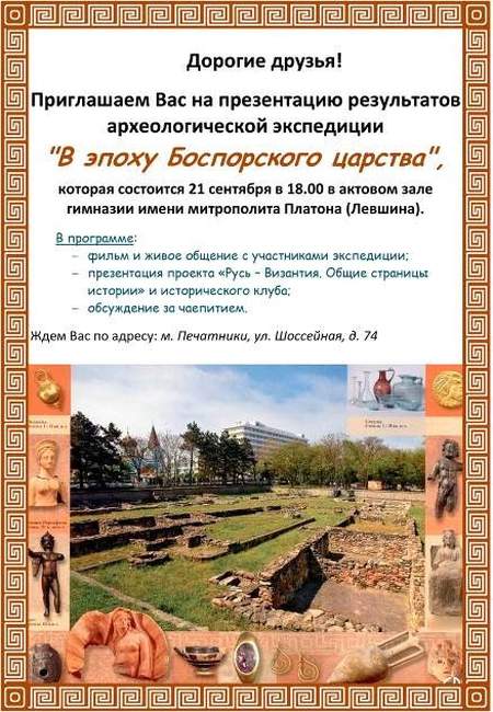 21 сентября в 18.00 проект будет презентован в рамках встречи, посвященной результатам археологической экспедиции "В эпоху Боспорского царства" на территории Северного Причерноморья, в которой принимали участие гимназисты.