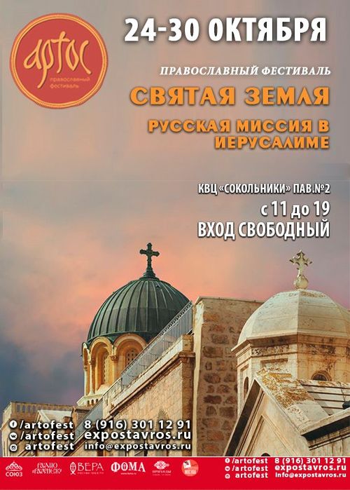 С 24 по 30 октября в московском концертно-выставочном комплексе «Сокольники» пройдет XIX Международный православный фестиваль «Артос» на тему «Святая Земля. Русская Миссия в Иерусалиме», вся программа которого будет посвящена Святой Земле в ознаменование 170-летия основания официального представительства Русской Православной Церкви в Святой Земле – Русской Духовной Миссии в Иерусалиме и 200-летнего юбилея знаменитого начальника Миссии архимандрита Антонина (Капустина), почетного члена Императорского Православного Палестинского Общества.