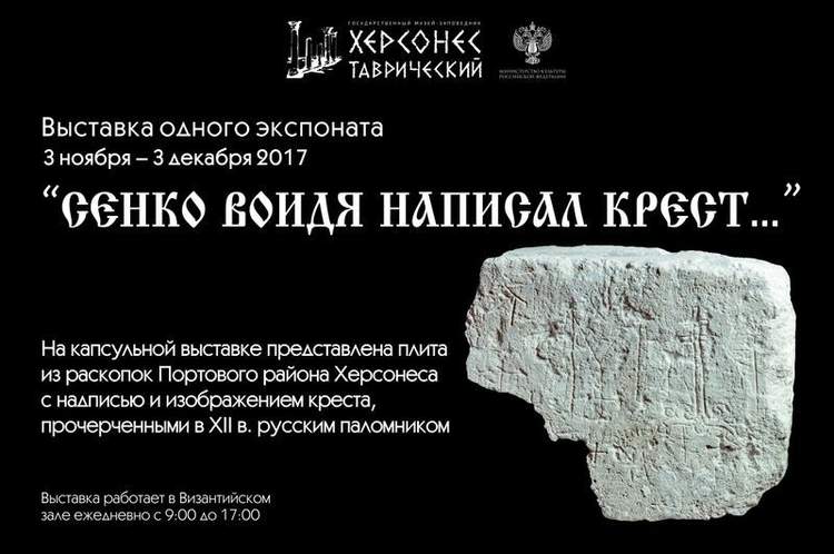 Экспонат представляет собой известняковый строительный блок из стены храма с автографом древнерусского паломника Сенка (Ксенофонта), посетившего в XII веке Херсонес (византийский Херсон).