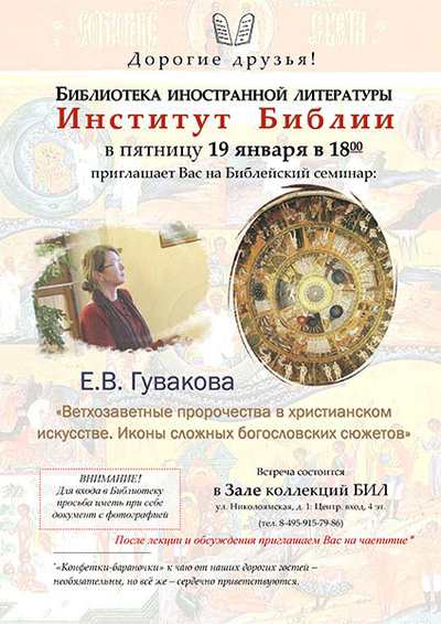 Библиотека иностранной литературы (Москва) и Институт Библии 19 января в 18-00 приглашают на лекцию специалиста по древнерусской живописи, сотрудника Государственного исторического музея Елены Витальевны Гуваковой "Ветхозаветные пророчества в христианском искусстве. Иконы сложных богословских сюжетов". Лекция будет сопровождаться демонстрацией слайдов, показывающих иконографическое воплощение: от Сотворения мира до Воскресения Христа.