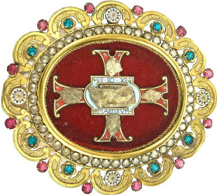 В экспозиции представлено более 60 экспонатов. В их числе такие священные реликвии, как Власы Богородицы; панагия Святой Великомученицы Веры; крест Святого апостола Иакова; медальоны, в том числе медальон Святого апостола Фомы и медальон «Четыре Евангелиста», и многие другие. Их оформление зачастую отличается от того, что принято в православной церкви, поскольку восходит к произведениям раннехристианского периода.