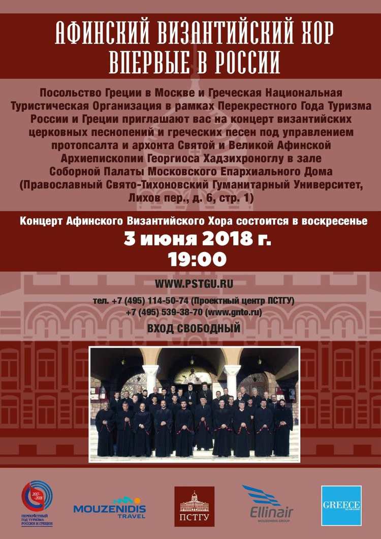В начале июня в Москве и Санкт-Петербурге состоятся концерты Афинского Византийского хора под управлением протопсалта и архонта Святой и Великой Афинской Архиепископии Георгиоса Хадзихроноглу. В программе - исполнение византийских церковных песнопений и греческих песен. Это первое выступление хора в России.