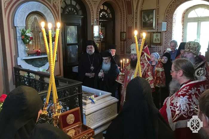 По окончании Литургии перед мощами преподобномученицы великой княгини Елисаветы иерархами Иерусалимской и Русской Православных Церквей и собором духовенства был совершен молебен.