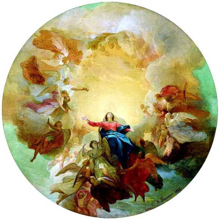 Размещение в куполе композиции на сюжет "Вознесение Богоматери" имеет давнюю традицию, идущую со времен Ренессанса. Эталоном для многих художников академической школы служил плафон для главного купола Пармского собора, выполненный Корреджо. В эскизе Басина чувствуется знание классических образцов, на основе которых он создал свое произведение. В композиционном построении он придерживался принципа размещения фигур по диагонали, что производит впечатление большей динамики масс. Главное направление движения от зрителя вверх к небесам усиливается цветовыми и светотеневыми контрастами, яркие пятна драпировок складываются в треугольник, вершиной которого является фигура Богоматери. Ощущение легкости и бестелесности возносящихся фигур возникает благодаря основному серо-голубому тону эскиза, объединяющему фигуры ангелов, херувимов, Богоматери, облака и небеса. Окончательный вариант плафона заметно отличается от эскизного: в нем все персонажи стали крупнее, фигура Богоматери переместилась ближе к центру, плафон стал более многофигурным. Приобретя более выразительную пластику, он утратил пространственную свободу, характерную для эскизного варианта.