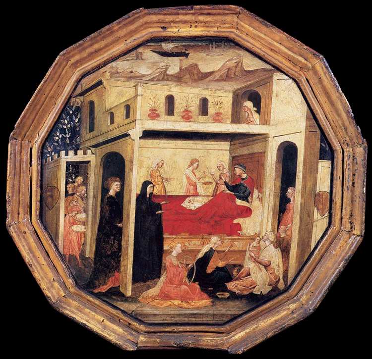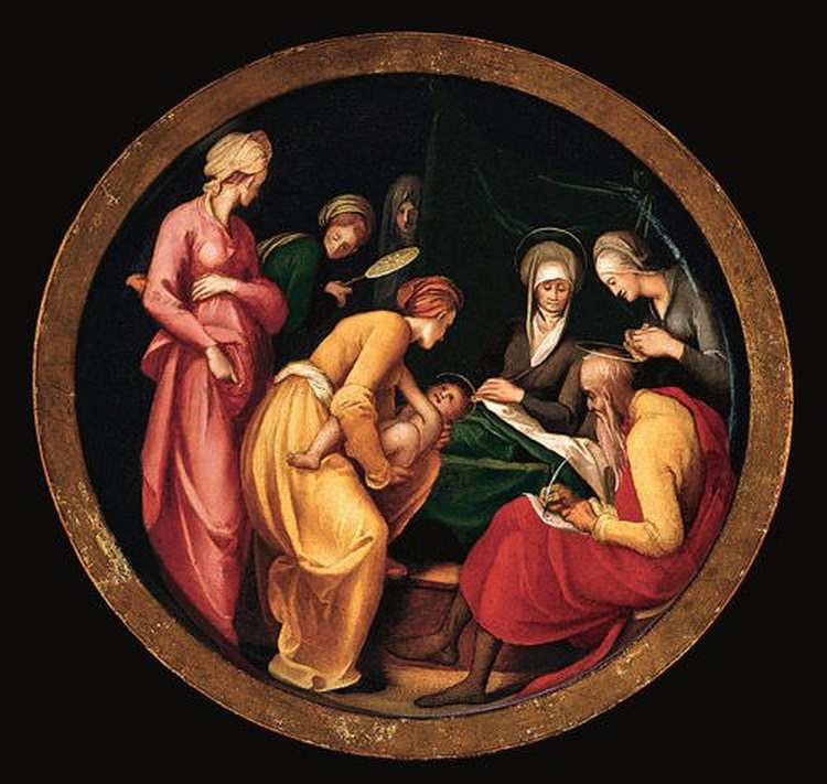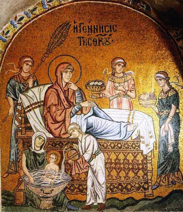Существовавшая в искусстве поздней античности иконографическая формула «рождества», по схеме которой изображались сцены рождения великих людей, в эпоху раннего средневековья была усвоена христианским искусством для изображения Рождества Богоматери и святых - например, Иоанна Предтечи и Николая Чудотворца. Впоследствии та же схема активно использовалась в Европе для изображения сцен рождения не святых персонажей - например, на знаменитых «деско да парто» ренессансной Италии.