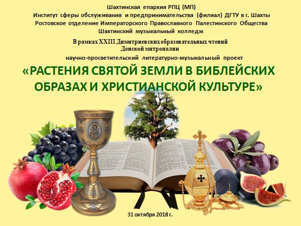 31 октября в Институте сферы обслуживания и предпринимательства (филиале) Донского государственного технического университета в г. Шахты проведена секция XXIII Димитриевских образовательных чтений Донской митрополии, на которой был представлен научно-просветительский литературно-музыкальный проект "Растения Святой Земли в библейских образах и христианской культуре".