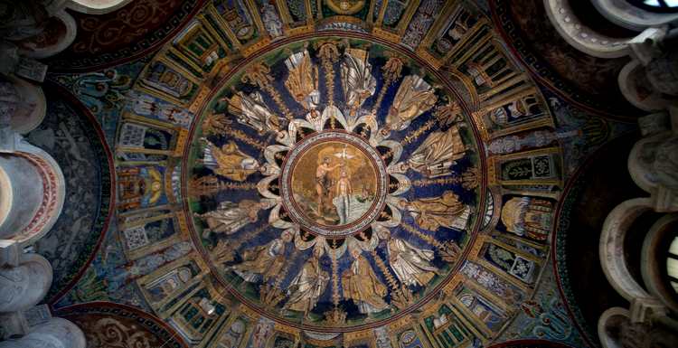 Эволюцию византийского храмового пространства невозможно понять без знакомства с центрическими постройками V-VI вв. Круглые или восьмиугольные сооружения не были изобретением византийских архитекторов. Как и базилики, этот архитектурный тип является наследием поздней Античности. Однако было бы неверным говорить о механическом копировании. Известная форма была заново переосмыслена, в результате чего появилось новое представление о тектонике храмовой архитектуры. Сохранившаяся живопись этого времени, прежде всего мозаики Равенны, показывают, что она перестает восприниматься лишь как часть общей декорации, как драгоценная инкрустация в убранстве интерьера храма. Поверхность стены перестает быть преградой, границей видимого мира. Живописное пространство сливается с архитектурной формой, бесконечно расширяя ее пределы.