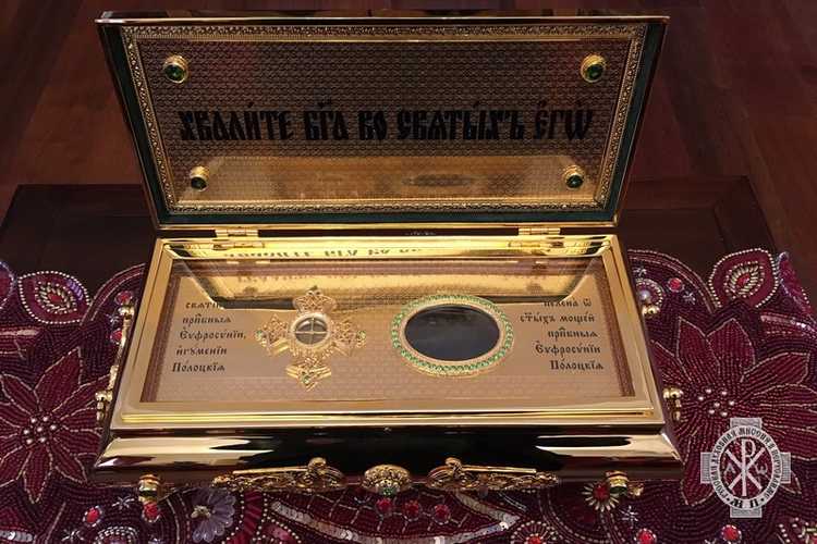 Драгоценную святыню принял начальник Русской духовной миссии в Иерусалиме архимандрит Александр (Еслисов). Ковчег с частицей мощей и пеленой преп. Евфросинии Полоцкой установлен для благочестивого поклонения в Троицком соборе Иерусалима.