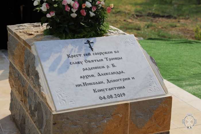 Здесь духовенство освятило крест и прилегающую территорию: молитву на освящения новосооруженного креста прочел архимандрит Александр, а окропление святой водой совершил митрополит Кириак.