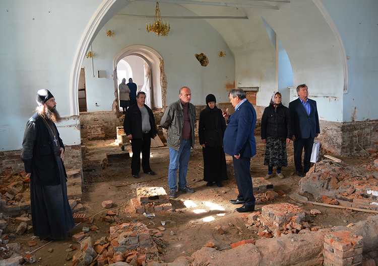 У церковной ограды Преображенского храма с. Батурино гостей приветствовал благочинный Северного церковного округа иерей Виталий Лукиных. В настоящее время здесь полным ходом ведется реставрация: вокруг здания установлены леса, завершается штукатурка фасадов, начаты внутренние работы в верхнем и нижнем храмах. Осмотрев церковное здание снаружи и изнутри, все прибывшие почтили память представителей священнического рода Капустиных у поклонного креста, установленного за алтарем храма, сфотографировались на память у бюста архимандрита Антонина, осмотрели парк и памятный знак, установленные рядом в честь 200-летия со дня рождения о. Антонина. В музейной комнате А. А. Брюханов передал инокине Магдалине издания ИППО, а иерей Виталий Лукиных – мешочек с землей с. Батурино и старинный кованый гвоздь из Преображенского храма.