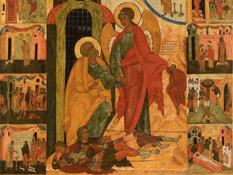 «И цепи упали с рук его. И сказал ему ангел: опояшься и обуйся. Он сделал так». Этот один из самых удивительных эпизодов из жизни апостола Петра описан в Деяниях апостолов. Заключенный за проповедь Христа в темницу, Петр был чудесным образом изведен оттуда ангелом. Именно этот момент запечатлел иконописец.