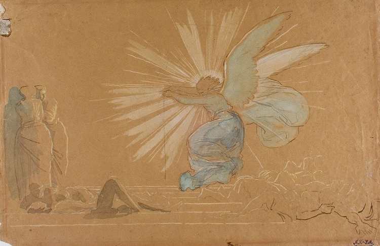 А.А. Иванов. Ангел возвещает женам о воскресении Христа. Эскиз. Конец 1840-х–1858. Бумага светло-коричневая, акварель, белила. 26,2 × 39,7. ГТГ