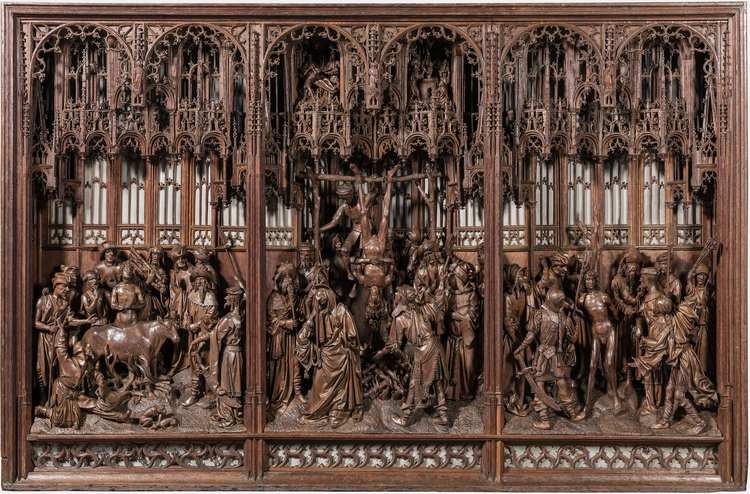 Монументальный алтарь размером 5 метров в ширину и 1,6 метра в высоту содержит более 80 фигур, вырезанных с изысканными деталями в архитектурном обрамлении в стиле высокой готики.