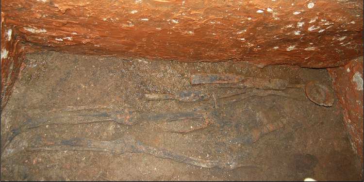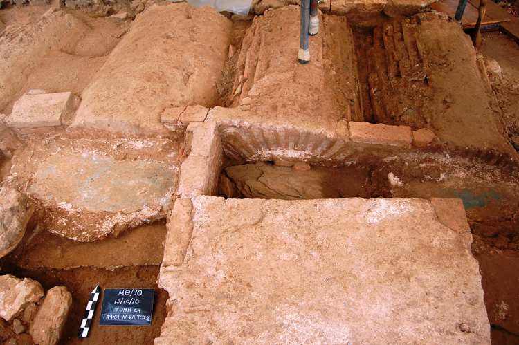 Одна арочная гробница содержала останки скелета взрослого человека, захороненного с оружием, в том числе — со щитом и наконечником копья. Лучше всего сохранившимся среди предметов его вооружения была спата — короткий меч, который использовался римской кавалерией в поздний имперский период (3 — 5 вв.). Его специально согнули, что в то время было крайне редким явлением для городских жителей Греции. Эта практика была более распространена среди кельтов и германцев. Римляне не гнули мечи, и практика захоронения оружия вообще необычна в контексте христианских погребений этого периода. Это считалось языческим ритуалом, поэтому найти меч в могиле внутри базилики — большая неожиданность. Это показатель высокого звания, которое погребенный, вероятно, занимал в армии.