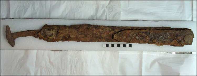 Согнутый меч указывает на то, что воин был «романизированным готом или из любого другого германского племени, который служил наемником (foederatus) в имперских римских войсках», — отмечает греческий археолог Маниотис.